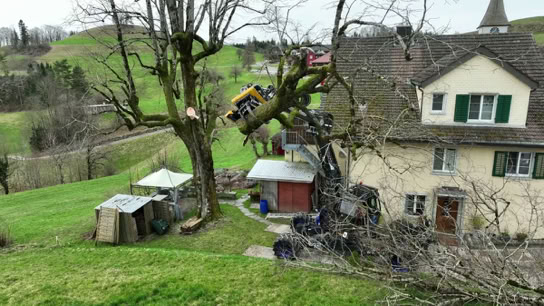 Bäume können in der Nähe von Häusern oder Strassen oft nicht konventionell gefällt werden. Die Gefahren sind einfach zu gross. Dieses 2-Minuten-Video zeigt, wie exponierte Bäume rasch, professionell und sicher gefällt und als Holzschnitzel abgeführt werden können.